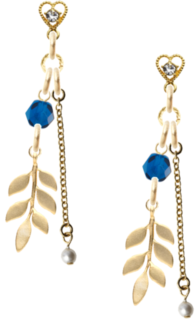 ラインストーンが付いたハートのピアスにリーフとパール付きチェーンが付いています。