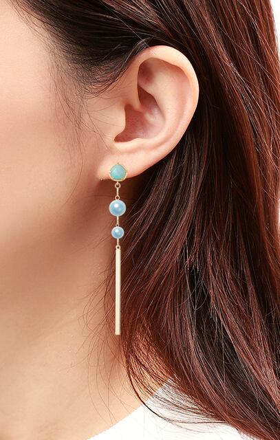 アマゾナイトを使用したピアスにスカイブルーの樹脂パールとスティックが付いており、涼しげなイメージのピアスとなっております。