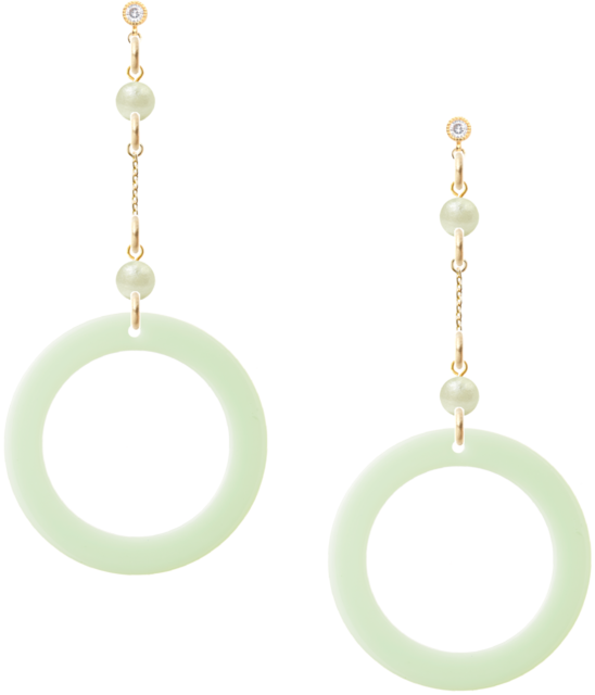 ラインストーンが付いたピアスにミントグリーンのコットンパール。それに表がパステルグリーン、裏がパステルピンクになったアクリルのフープが付いています。